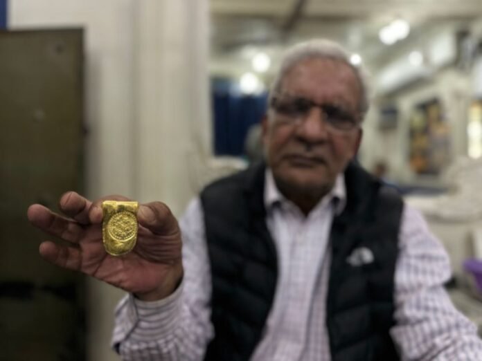 A goldsmith in Srinagar displays 150 grams of pure gold costing around $27,500 as gold prices soar [Sadaf Shabir/Al Jazeera]