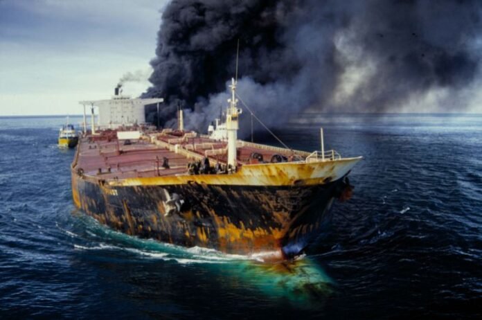 The ‘Pivot’ tanker in flames in the Strait of Hormuz in 1987 during the Iran-Iraq war [File: Francoise De Mulder/Roger Viollet via Getty Images]