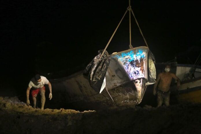 A boat carrying decomposing bodies is lifted to shore by authorities at the Vila do Castelo port in Braganca, Brazil, April 15, 2024. Brazilian police investigating the discovery of the boat with several dead bodies say they were likely migrants from Mali and Mauritania [Raimundo Pacco/AP Photo]