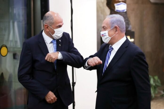 Slovenian then Prime Minister Janez Jansa and Israeli Prime Minister Benjamin Netanyahu met in Jerusalem on December 8, 2020 [Ohad Zwigenberg/Pool via Reuters]