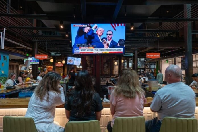 A bar in Milwaukee shows TV news coverage of the Trump shooting in July 2024 [File: Spencer Platt/Getty Images via AFP]