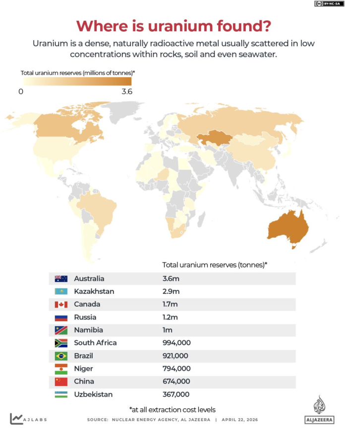 Uranium is a dense metal used as a fuel in nuclear reactors and weapons. It is naturally radioactive and usually found in low concentrations in rocks, soil and even seawater. About 90 percent of the world’s uranium is produced in just five countries: Kazakhstan, Canada, Namibia, Australia and Uzbekistan. Reserves of uranium have also been found in other countries.